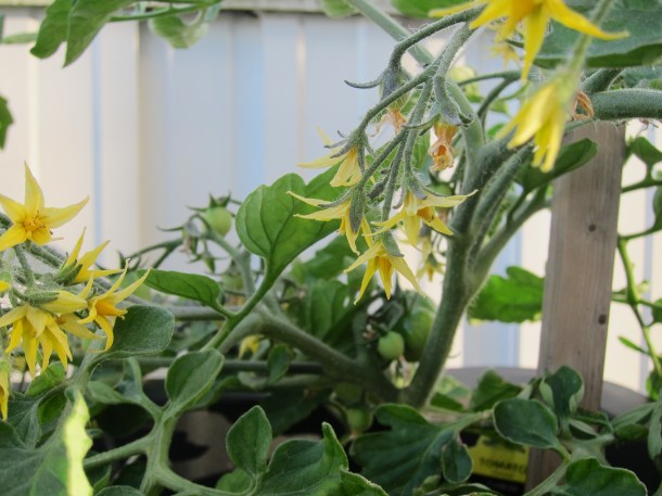 There are dozens of tiny green tomatoes on this plant.  Even more exciting, there are dozens more bright yellow flowers….